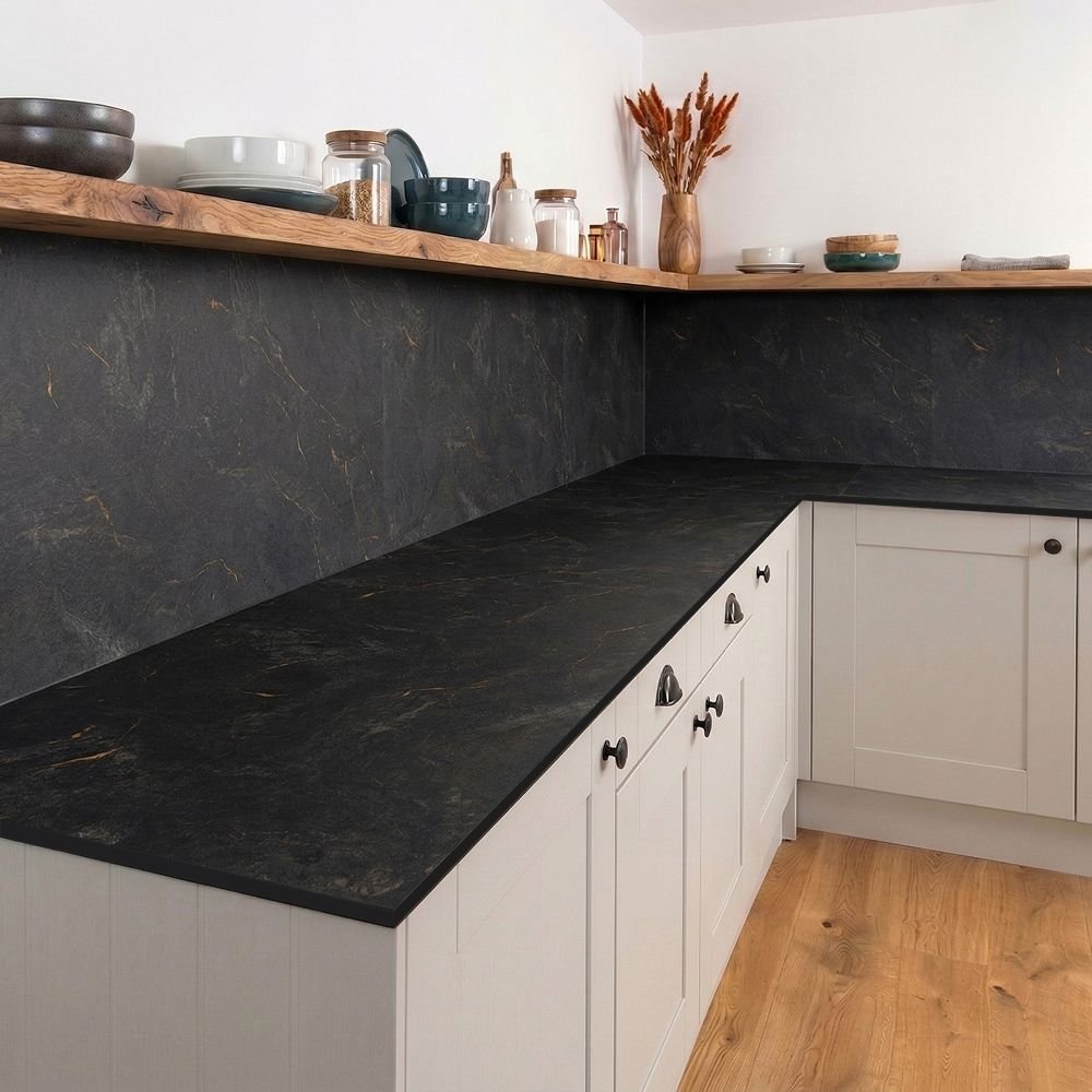 A multi-tonal, dark metallic & gold laminate upstand, the compact Black Gold replicates the luxurious appearance of real, polished metal. Perfect for homeowners, designers and commercial spaces seeking contemporary luxury. With its rich metallic tones and a bold yet refined aesthetic, this solid core upstand is sure to make a memorable statement wherever it's installed.