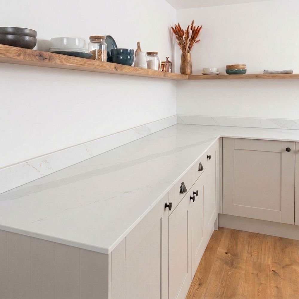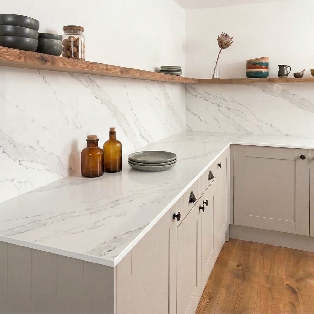 Calacatta Marble Compact features elegant classic Calacatta light-grey veins gently flowing through a white backdrop. With a matt, silky-smooth finish, this compact laminate upstand and splashback is stylish, durable, and effortlessly versatile — perfect for adding warmth and sophistication to your kitchen.