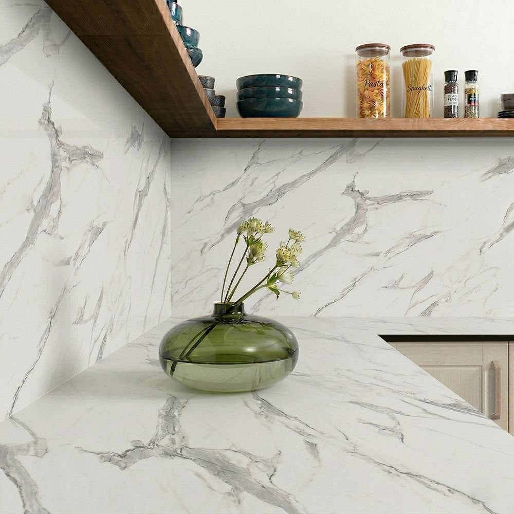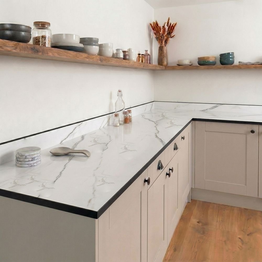 The Carrera Marble (Dark Core) compact laminate upstand and splashbacks offers subtle grey marble veining and a cool white background. From a design point of view, what sets this laminate upstand apart is its dark core – the thin band of black detailing provides sleek balance to the surface’s blend of white and grey, creating a monochrome look that will fit naturally into any kitchen, modern or traditional.