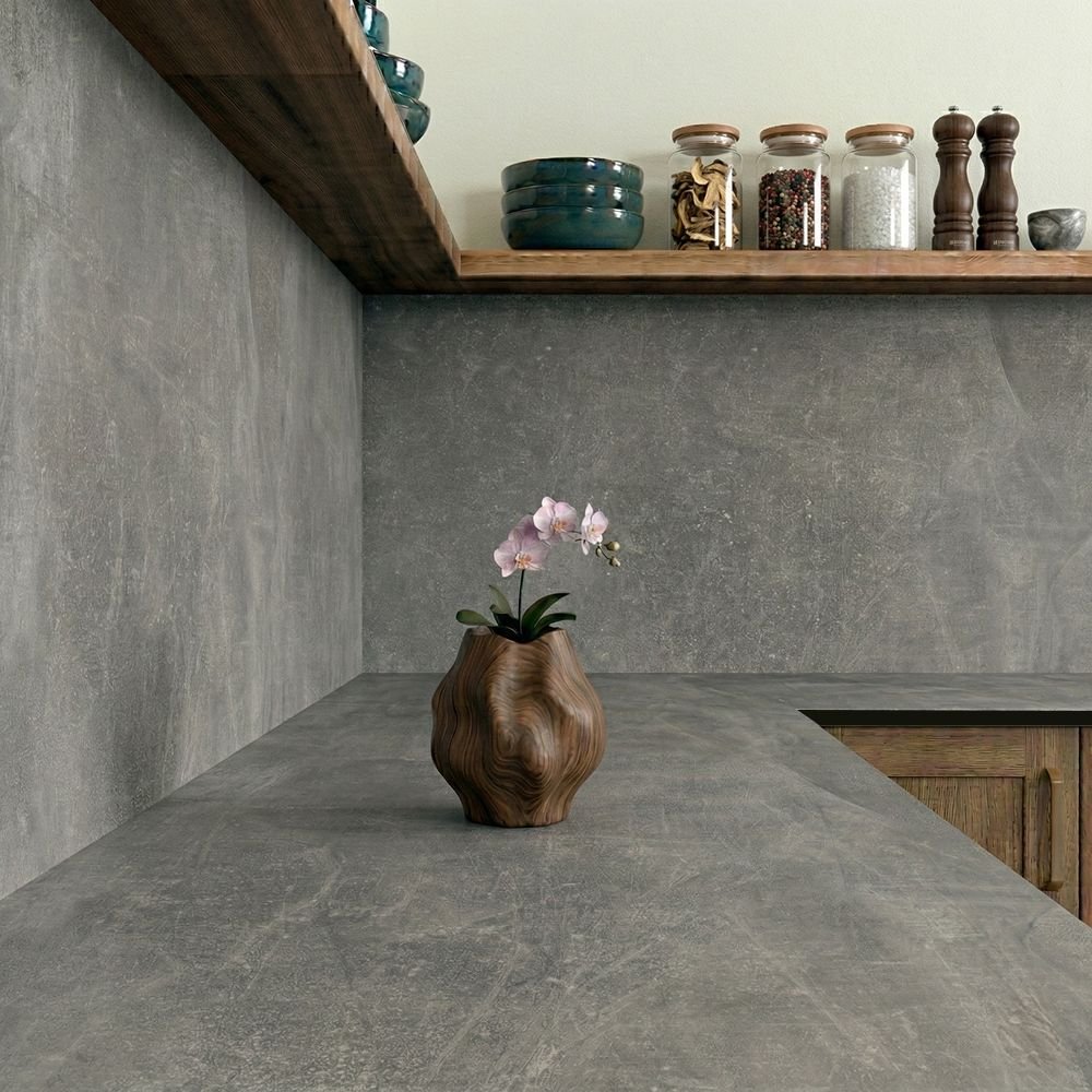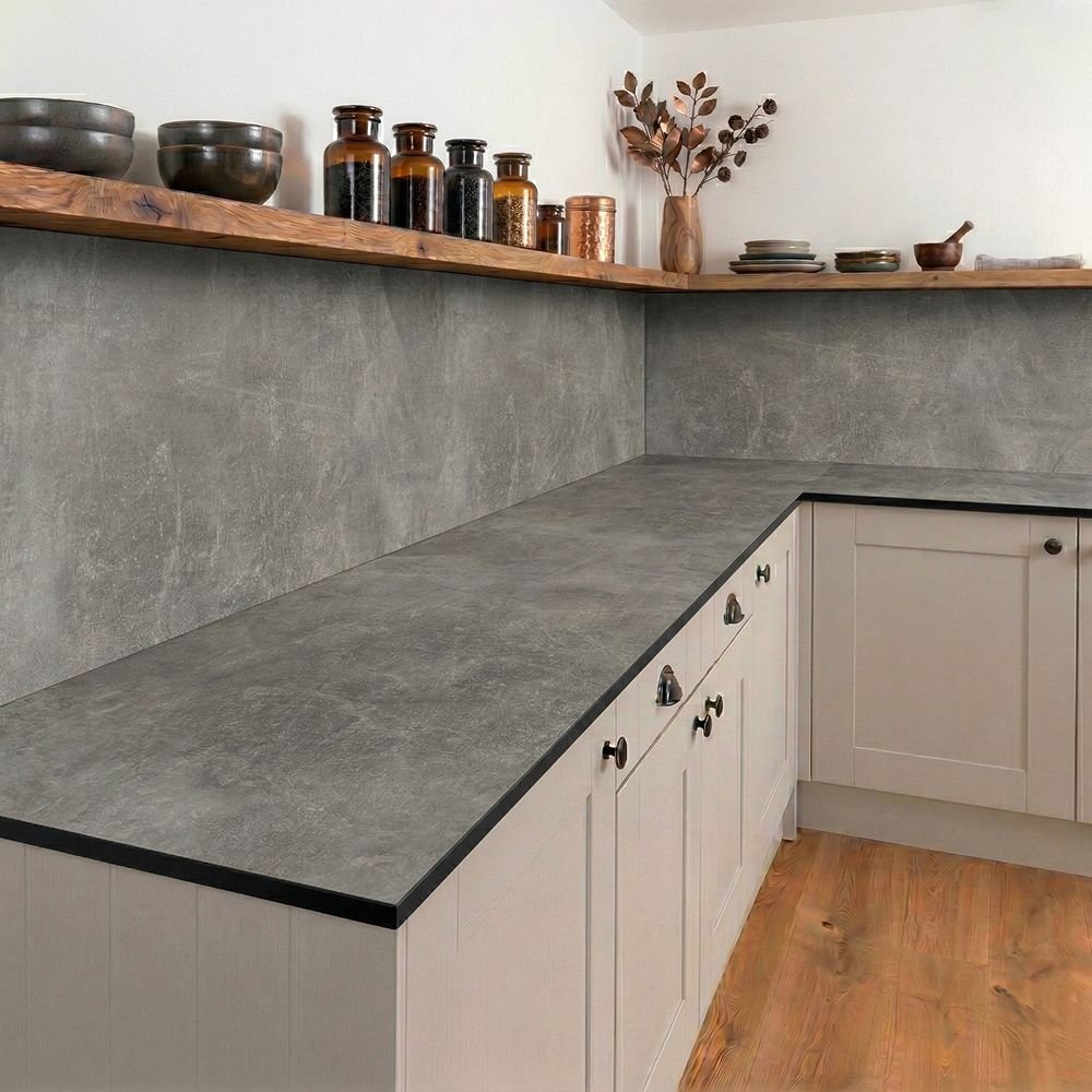 With the realistic look of gently worn cement, our Cloudy Cement compact laminate upstands and splashbacks are the ideal addition for modern and industrial kitchen styles. While the textured surface mimics the real thing, it feels smooth to the touch and is very easy to clean.