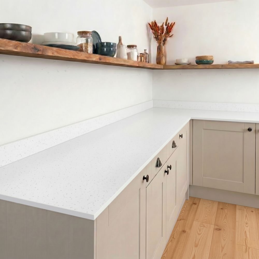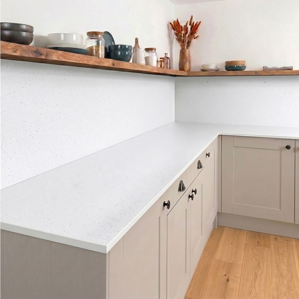 An elegant white quartz compact laminate upstand and splashback offering a clean, modern aesthetic, ideal for bringing depth and sophistication to any kitchen. With its crisp, luminous finish, the Crystal Spark is the perfect choice for homeowners seeking a timeless yet contemporary look.